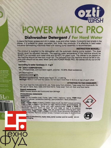 Жидкое моющее средство POWER MATIC PRO рекомендуется для использования на профессиональной кухне. Средство предназначено для жесткой воды, показатели pH - около 12.